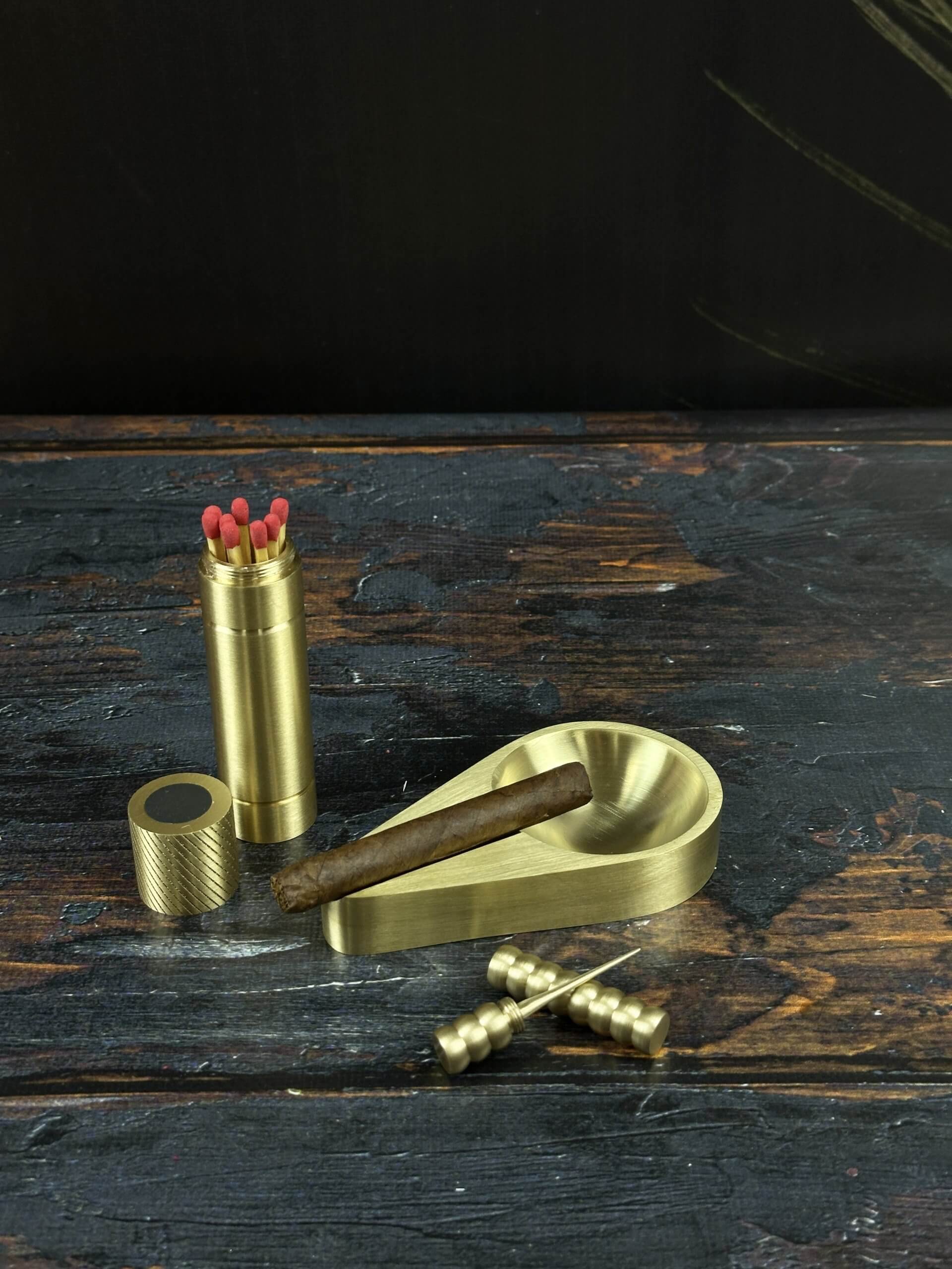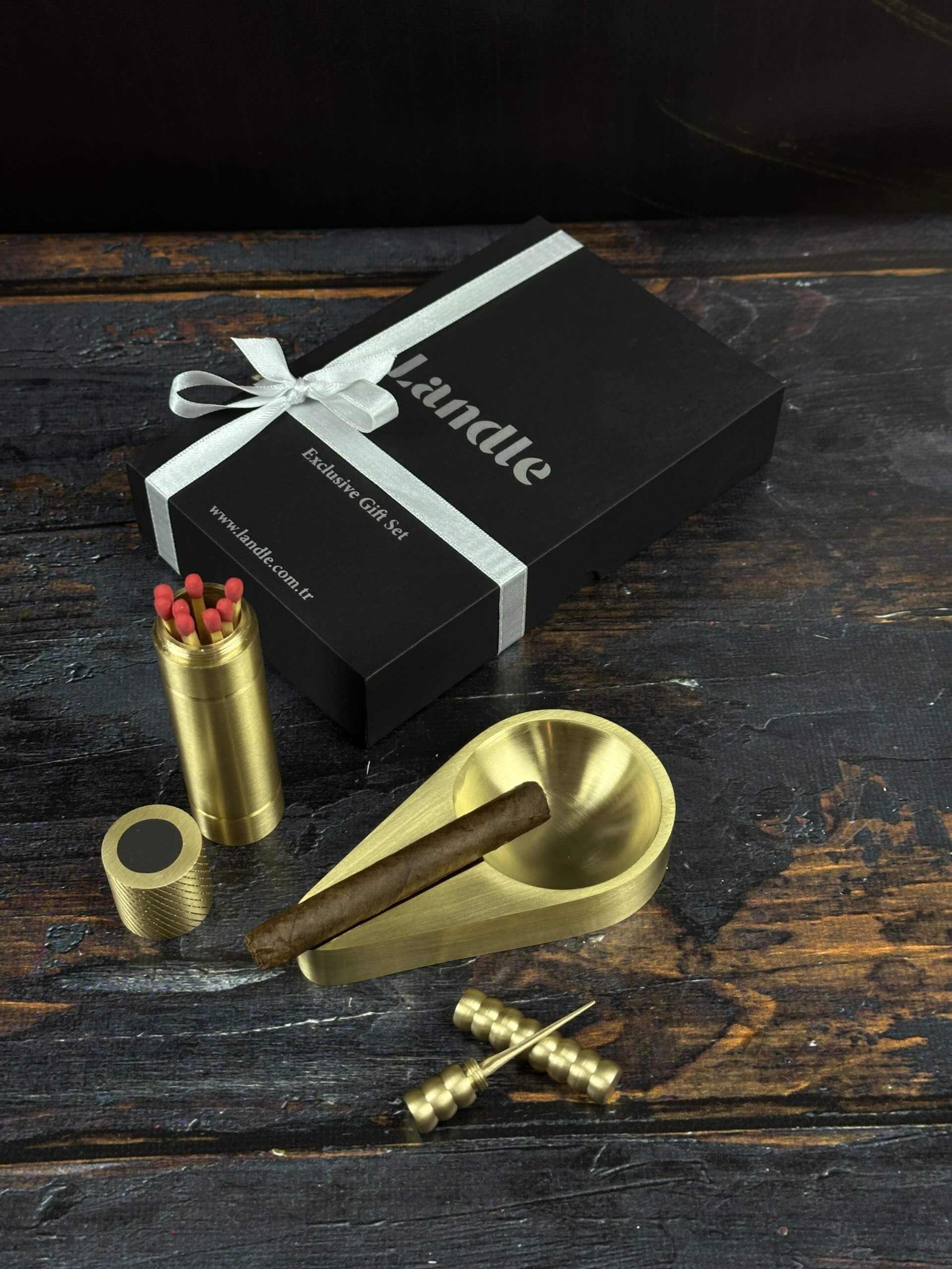 Döküm Pirinç Puro Hediye Gift Set Puro Küllüğü, Kibritlik ve Puro İğnesi Hediye Kutusu İçerisinde